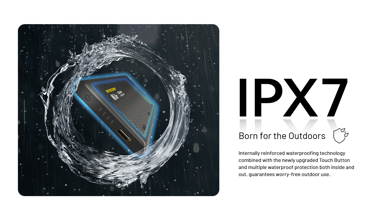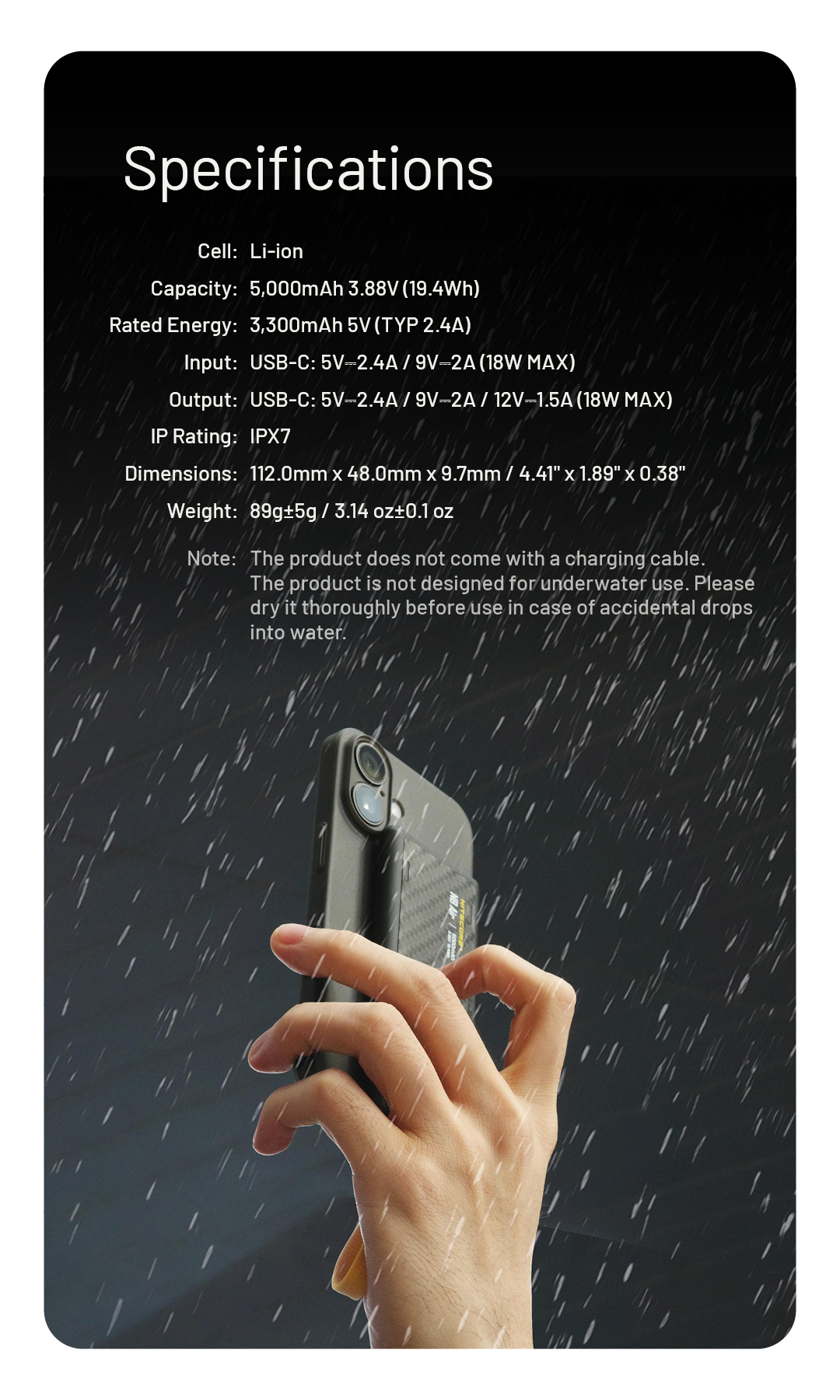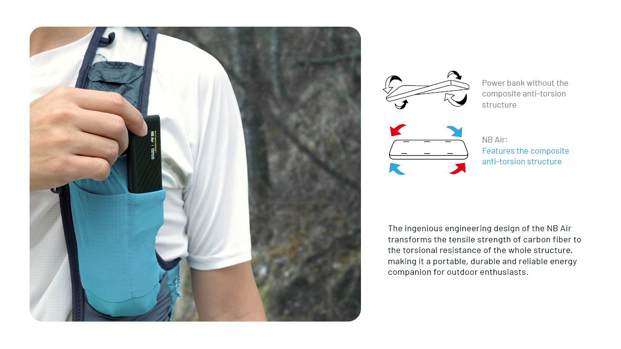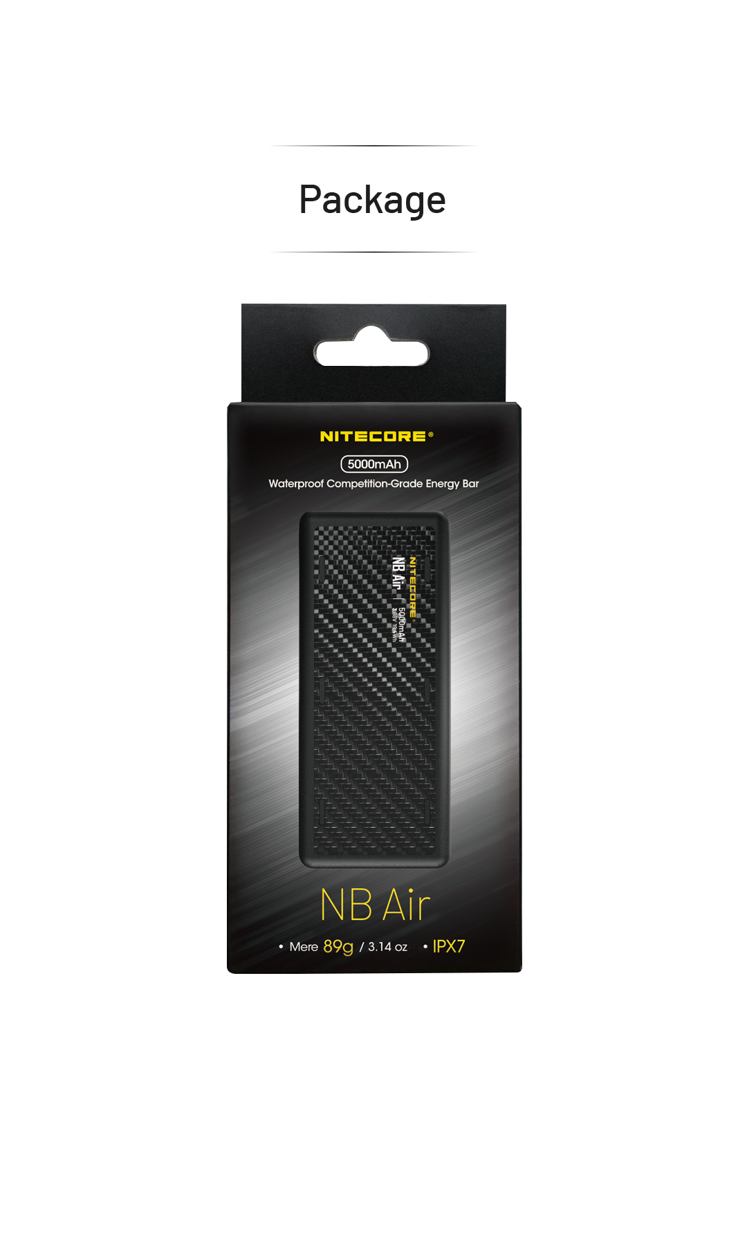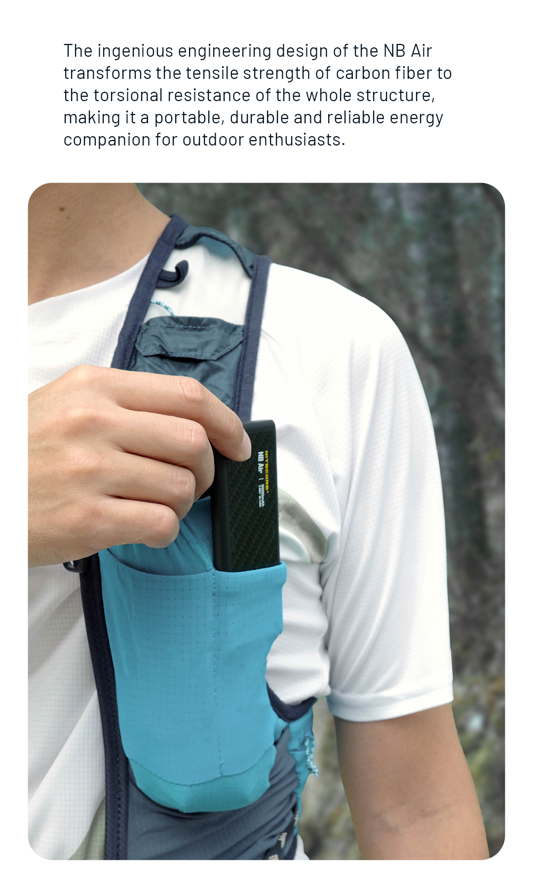 The NB Air, Waterproof Competition-Grade Energy Bar, weighing only 89g / 3.14 oz, provides a backup power of 5000mAh with a max 18W output. The IPX7 rating and the self-developed composite anti-torsion structure, make the NB Air a portable, durable and reliable energy companion for outdoor enthusiasts.
