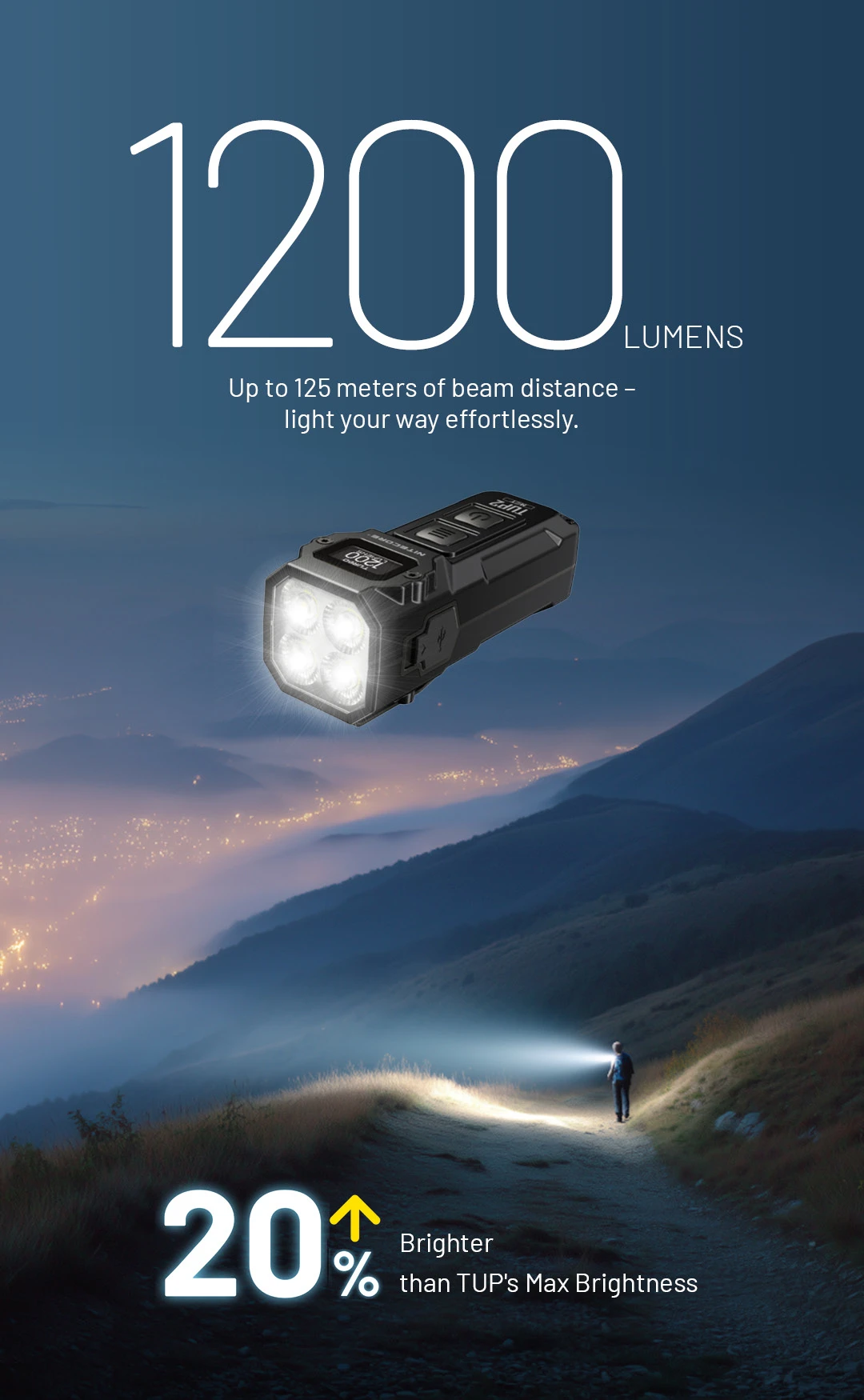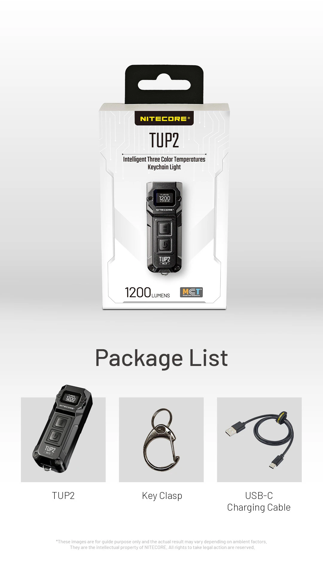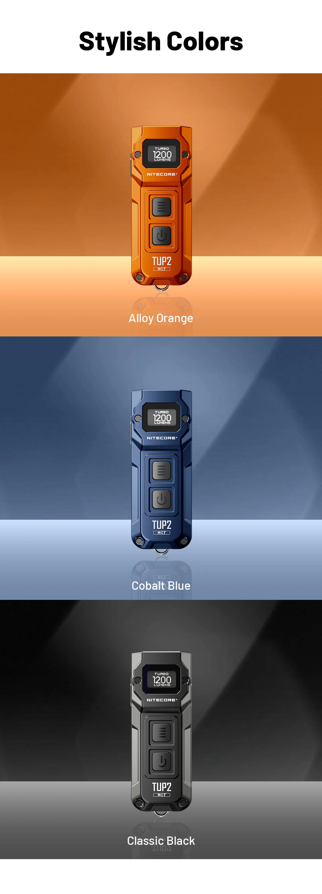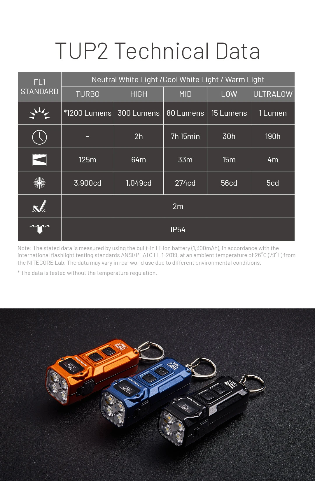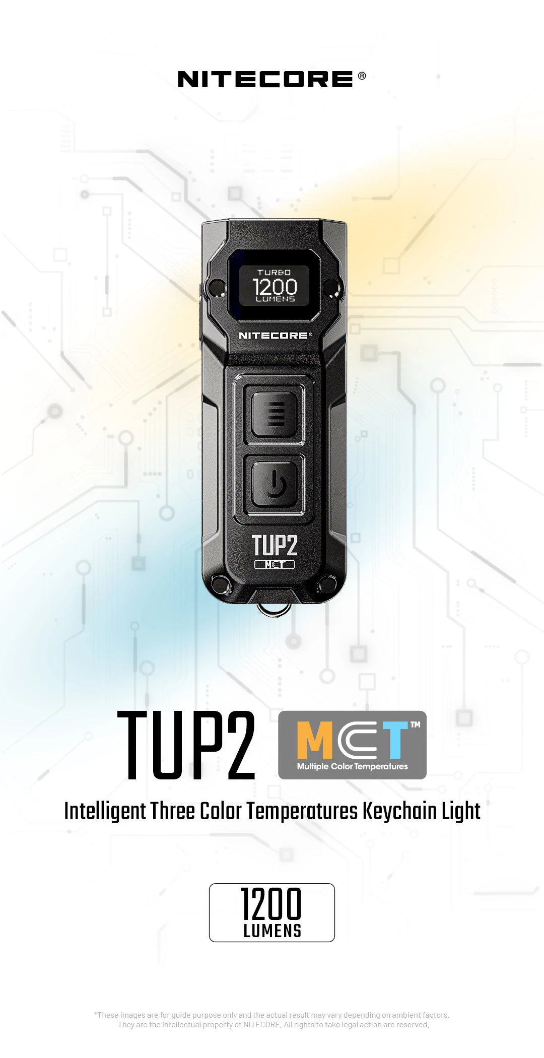 Equipped with four quad-core MCT UHE LEDs, the NITECORE TUP2 Intelligent Three Color Temperatures Keychain Light features flexible color temperature switching, and flashlight-level performance with a max output of 1,200 lumens and 125-meter long range. With up to 190 hours of runtime and an OLED real-time display, it combines cutting-edge technology with outstanding performance.