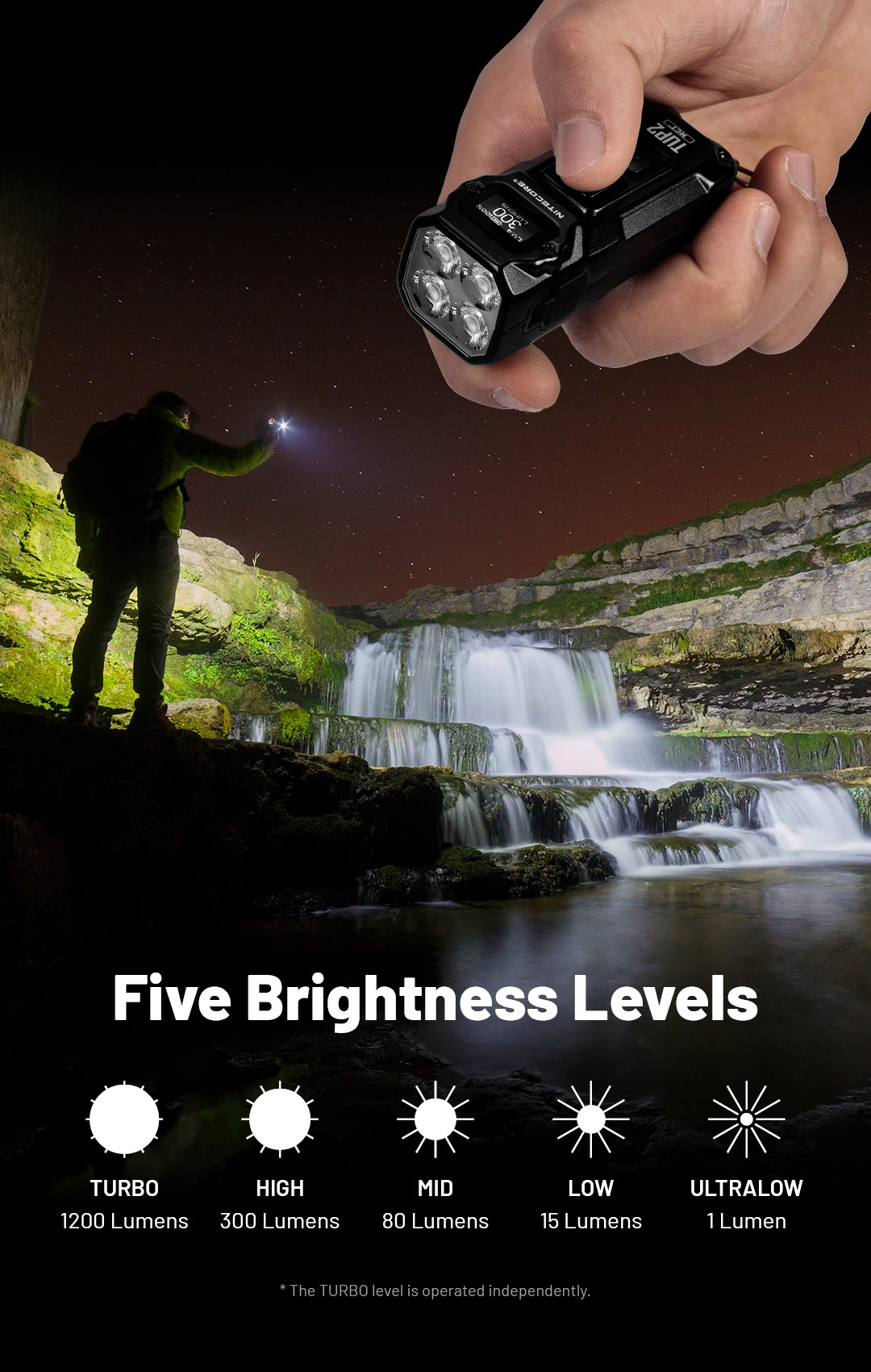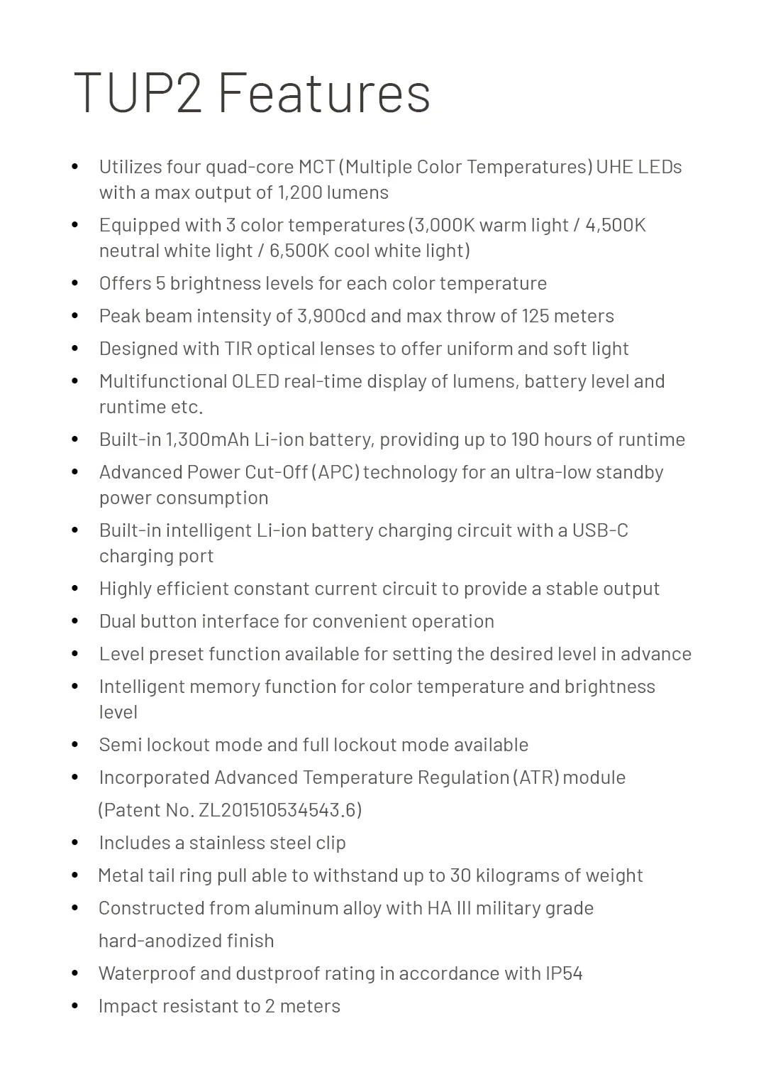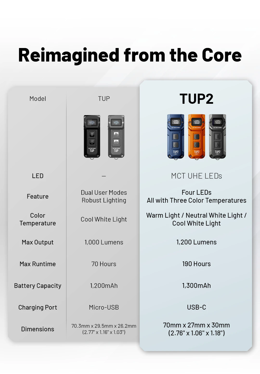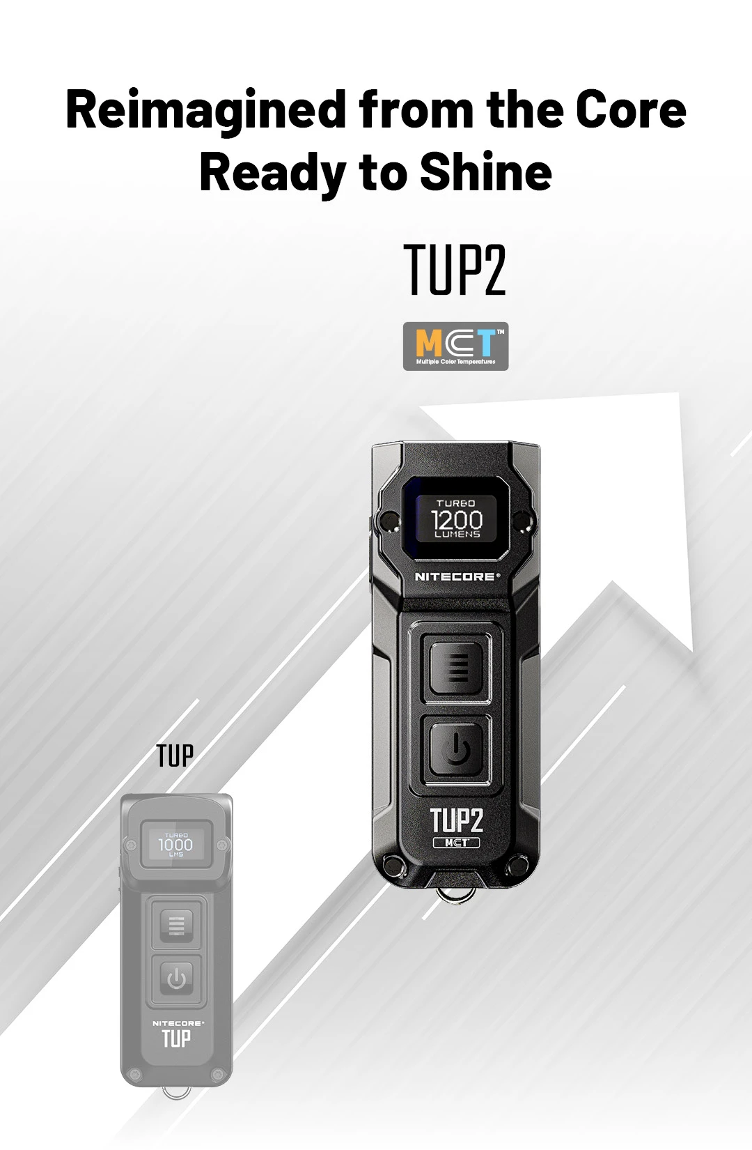 Equipped with four quad-core MCT UHE LEDs, the NITECORE TUP2 Intelligent Three Color Temperatures Keychain Light features flexible color temperature switching, and flashlight-level performance with a max output of 1,200 lumens and 125-meter long range. With up to 190 hours of runtime and an OLED real-time display, it combines cutting-edge technology with outstanding performance.