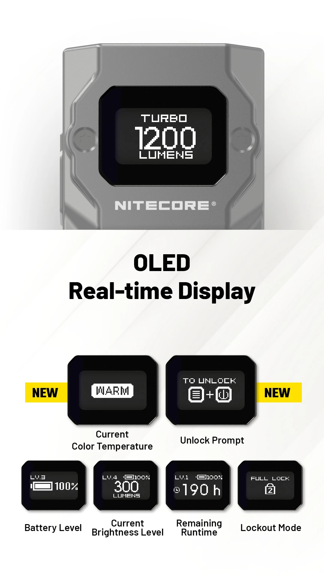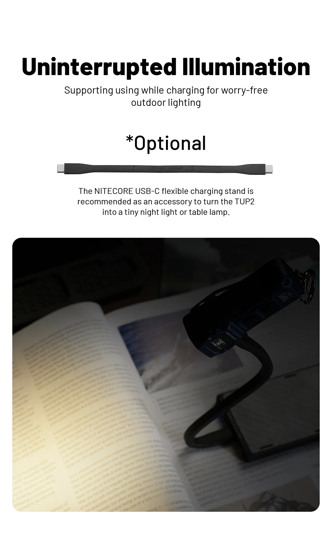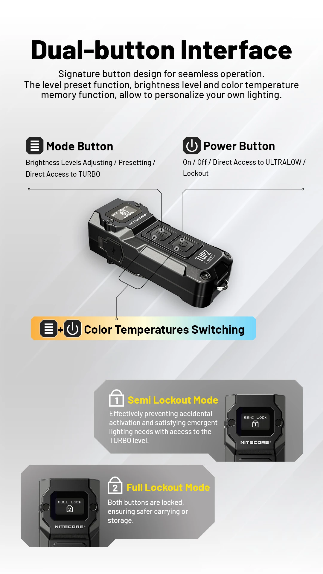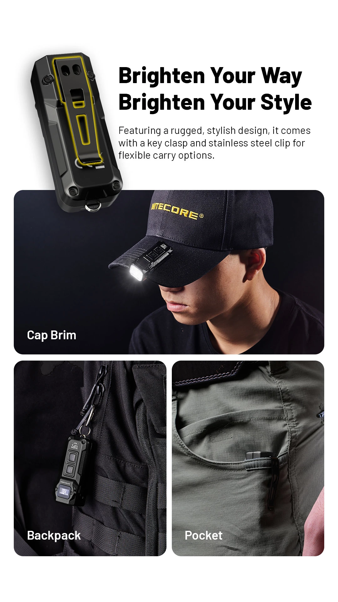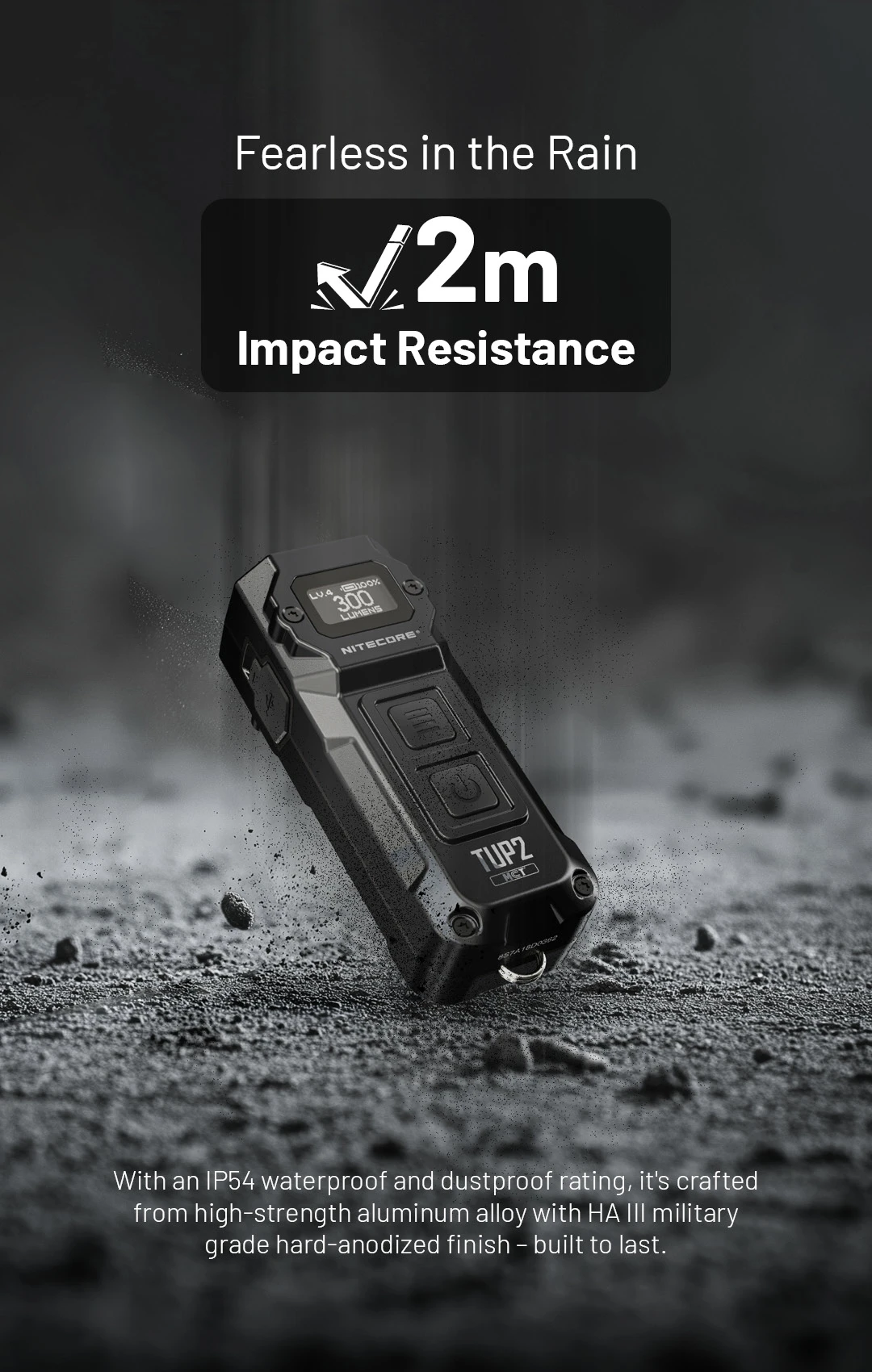 Equipped with four quad-core MCT UHE LEDs, the NITECORE TUP2 Intelligent Three Color Temperatures Keychain Light features flexible color temperature switching, and flashlight-level performance with a max output of 1,200 lumens and 125-meter long range. With up to 190 hours of runtime and an OLED real-time display, it combines cutting-edge technology with outstanding performance.