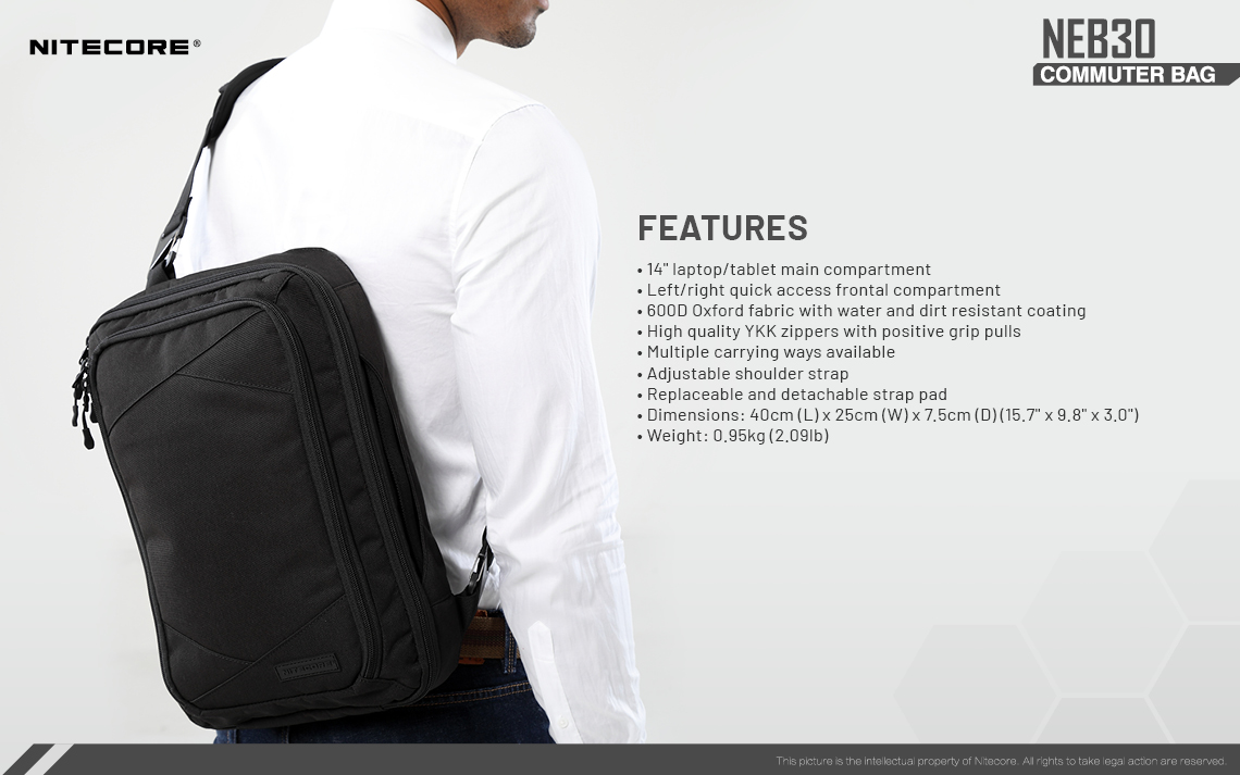 NEB30 The NITECORE NEB30 is designed with multiple ways of carrying. The main compartment with full opening and the quick access frontal compartment make it the best choice for commuting and business trips.